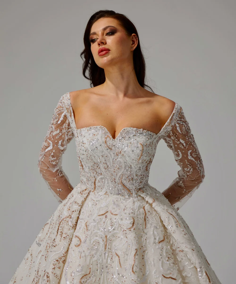 Long Sleeve Sequined Princess Wedding Dress offers enchanting elegance and sparkle. This dress, meeting the unique design of the A-Line category, showcases a dazzling look with its long sleeves and sequined details. Elegant sequins add a sparkling touch to the dress, while the long sleeves accentuate your elegance. This dress will captivate with its unique sparkle and elegance on your special day.