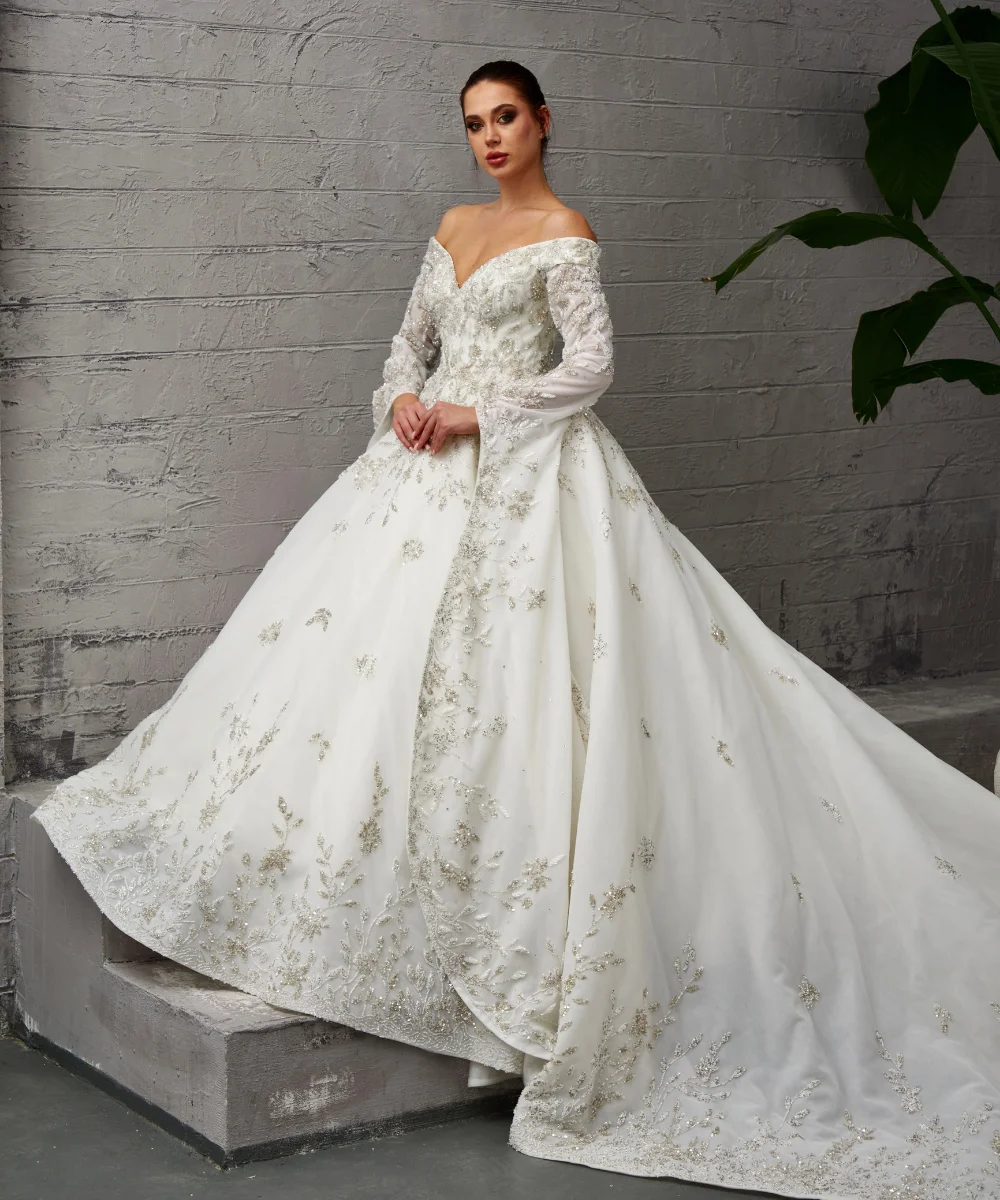 Off Shoulder Gold Embroidered Wedding Dress offers a dazzling elegance. This dress, meeting the unique design of the Princess category, showcases a captivating look with its off-shoulder cut and gold embroidered details. Gold embroideries add a sparkling touch to the dress, while the off-shoulder design brings a modern flair. This dress will dazzle with your unique sparkle on your special day and make you feel like a princess.