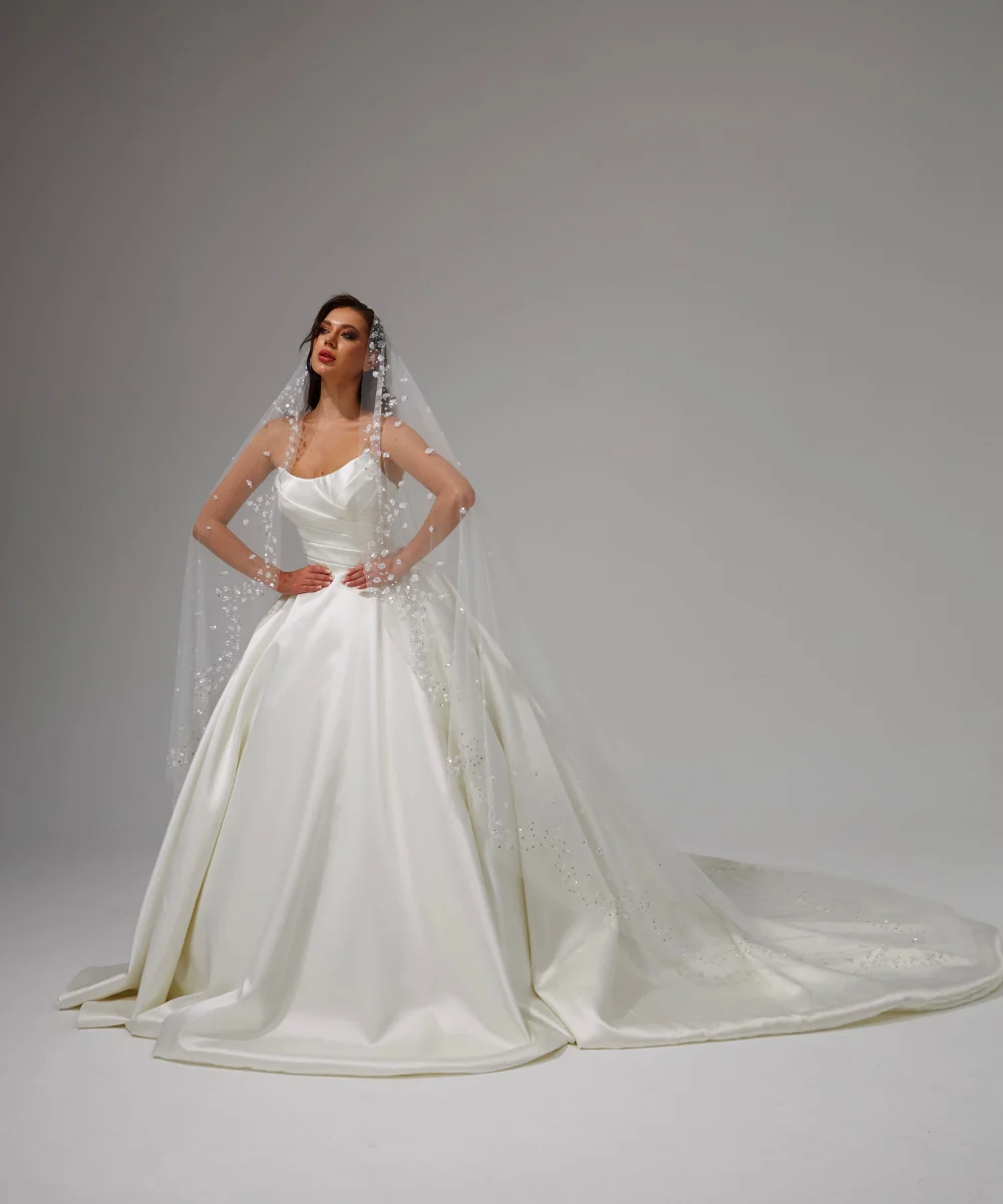 Spaghetti Strap Satin Wedding Dress With Floral Veil offers graceful romance and unique elegance. This dress, meeting the unique design of the A-Line category, dazzles with its intricate lace details and chiffon fabric. Delicately crafted floral patterns add a romantic touch to the dress, while the lightness of the chiffon fabric gives you a sense of freedom. The delicately crafted spaghetti straps provide an elegant touch to the dress, while the floral veil creates a fairytale atmosphere. With this dress, you will achieve an unforgettable look on your special day.
