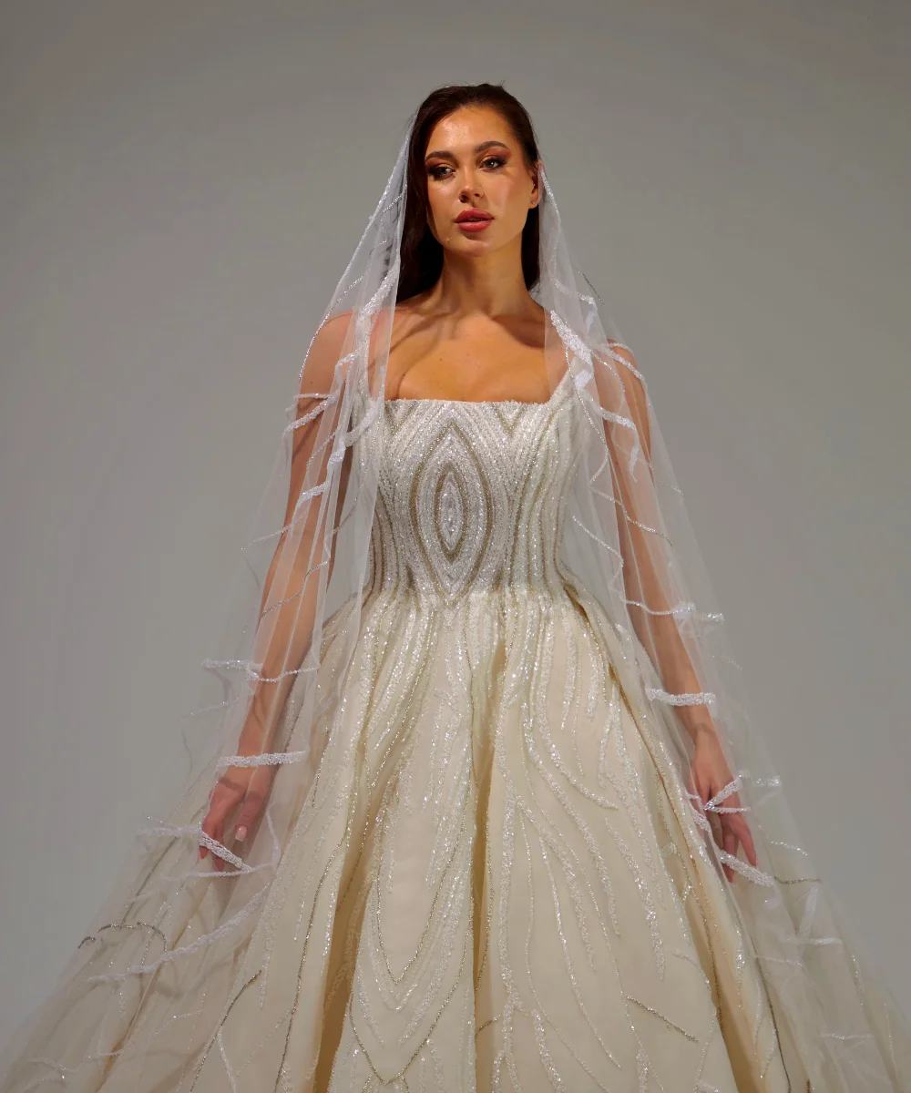 Strappy Glitter Wave Patterned Wedding Dress offers an enchanting elegance that will make you feel like a princess. This dress, meeting the unique design of the Princess category, captivates with its strappy details and glittery wave pattern. Elegant straps add a modern touch to the dress, while the glittery wave pattern creates a fairytale atmosphere. This dress will make you feel like a true princess on your special day.